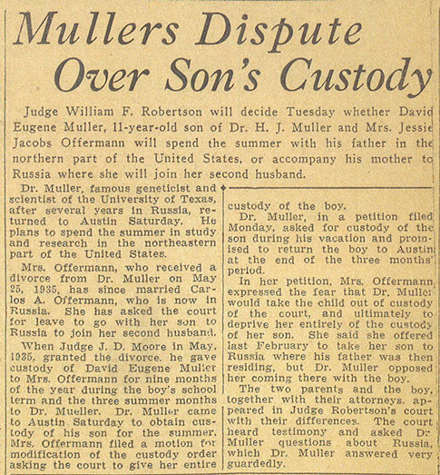 Muller’s custody dispute with his first wife Jessie Muller over his son David was front page news in the Austin American Newspaper, June 9, 1936.