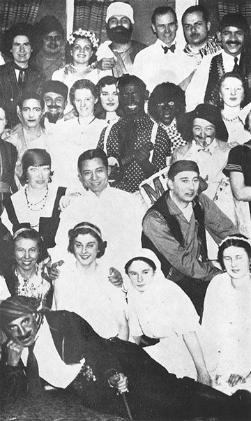 Muller (pirate in the foreground) with his second wife Dorothea (newsvendor, third row top right with hat and mustache) at a Masquerade Party at the Edinburgh Institute for Animal Genetics in 1938.