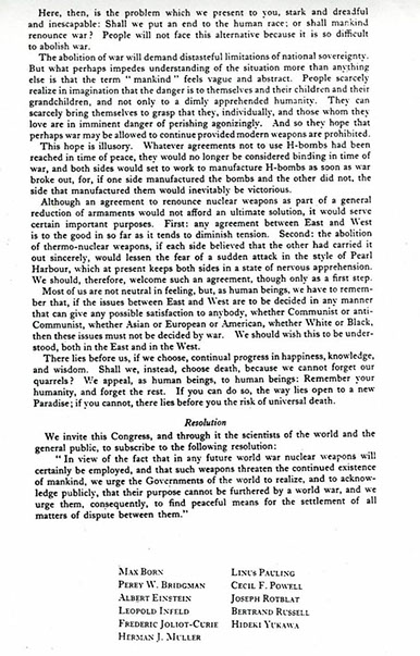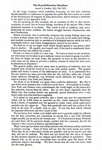 The Russell-Einstein Manifesto signed by Muller, Linus Pauling, Albert Einstein, Bertrand Russell & seven others was issued at a press conference in London on 9 July 1955, and was sent as a warning to leaders of nations that possessed nuclear weapons or were capable of possessing them at that time