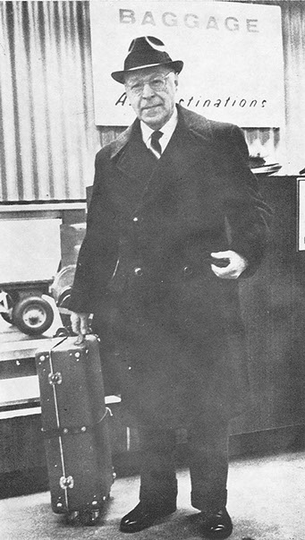 Traveling became a way of life for Muller. Dorothea designed the suitcase on rollers to lessen the strain of carrying luggage. He presented several dozen public lectures after he joined the Indiana University Faculty, ca. 1960s.