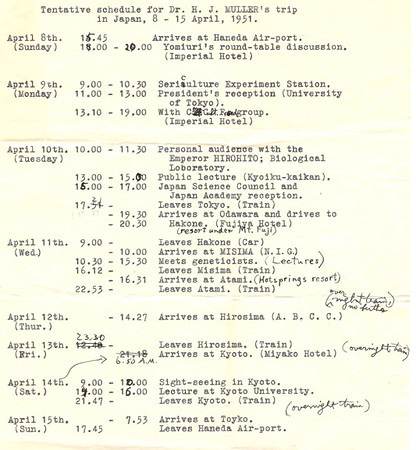 Hermann’s 1951 itinerary for Japan, which he stopped at after India on his “round the world” trip. The Emperor gave Hermann a special crab that has the face of a samurai warrior on its belly. On April 12th Hermann went to Hiroshima (shortly after it was bombed) which must have had a tremendous impact on Hermann and ultimately drove him to sign the Einstein-Russell Manifesto.
