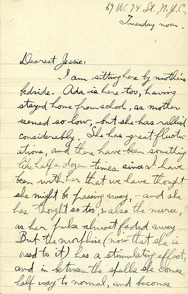 Letter from Muller to his first wife Jessie about the health of his mother Frances and also discusses his sister Ada, 1927.