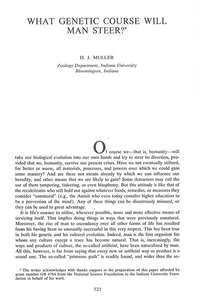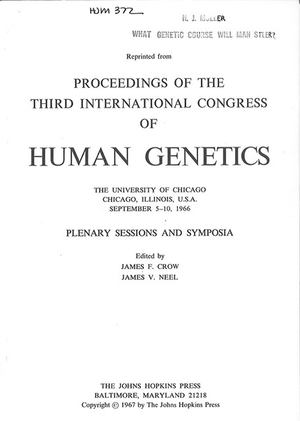 “At the International Congress of Human Genetics in Chicago in 1966, Muller presented his last paper. His concern over human aggression, especially through war, made him favor the selection of genes which permitted cooperative behavior as even more important than genes favoring high intelligence. It required great effort for him to make the trip and to give this lecture. He realized that this might be the last occasion where he would be able to speak out to his colleagues and he was determined to get across to them his great concern for the genetic improvement of man”