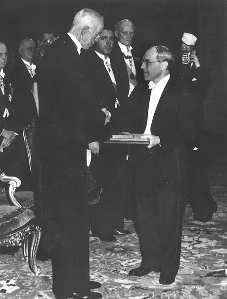 Muller receives the 1946 Nobel Prize in Physiology or Medicine from King Gustav in Stockholm "for the discovery of the production of mutations by means of X-ray irradiation.”
