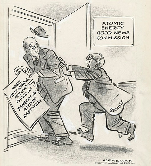 In this 1955 editorial cartoon drawing, cartoonist Herb Block presents H.J. Muller and his work on the dangers of atomic radiation being pushed out of the Atomic Energy Good News Commission. Muller's work studying radiation and genetics prompted him to work to raise awareness of the dangers of radioactive fallout and nuclear testing. "Sorry—it doesn't fit with the official line”