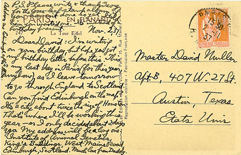 Postcard sent to David Muller on his birthday, Hermann discusses his new job in Edinburgh (where he meets his second wife), 1937.